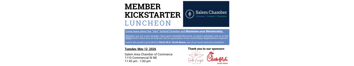 Come join us at the Chamber office for an orientation on the "why" behind the Salem Chamber. Meet the staff, some board members and enjoy a wonderful lunch catered by one of our faithful members. Whether you are a new member or a veteran, we invite you to join us as there are always new things to learn and new people to connect with. Registration will close two days before event