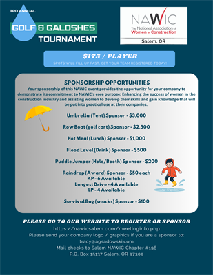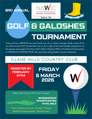 Prove just how OREGON you are! Come out, rain or shine, and get ready to tee off at our third annual Golf Tournament! Join us for a day of fun and friendly competition on the greens and support the Non-Profit Salem Chapter #198 of the National Association of WOMEN IN CONSTRUCTION. Rain ponchos and galoshes may be necessary. galoshes may be necessary.